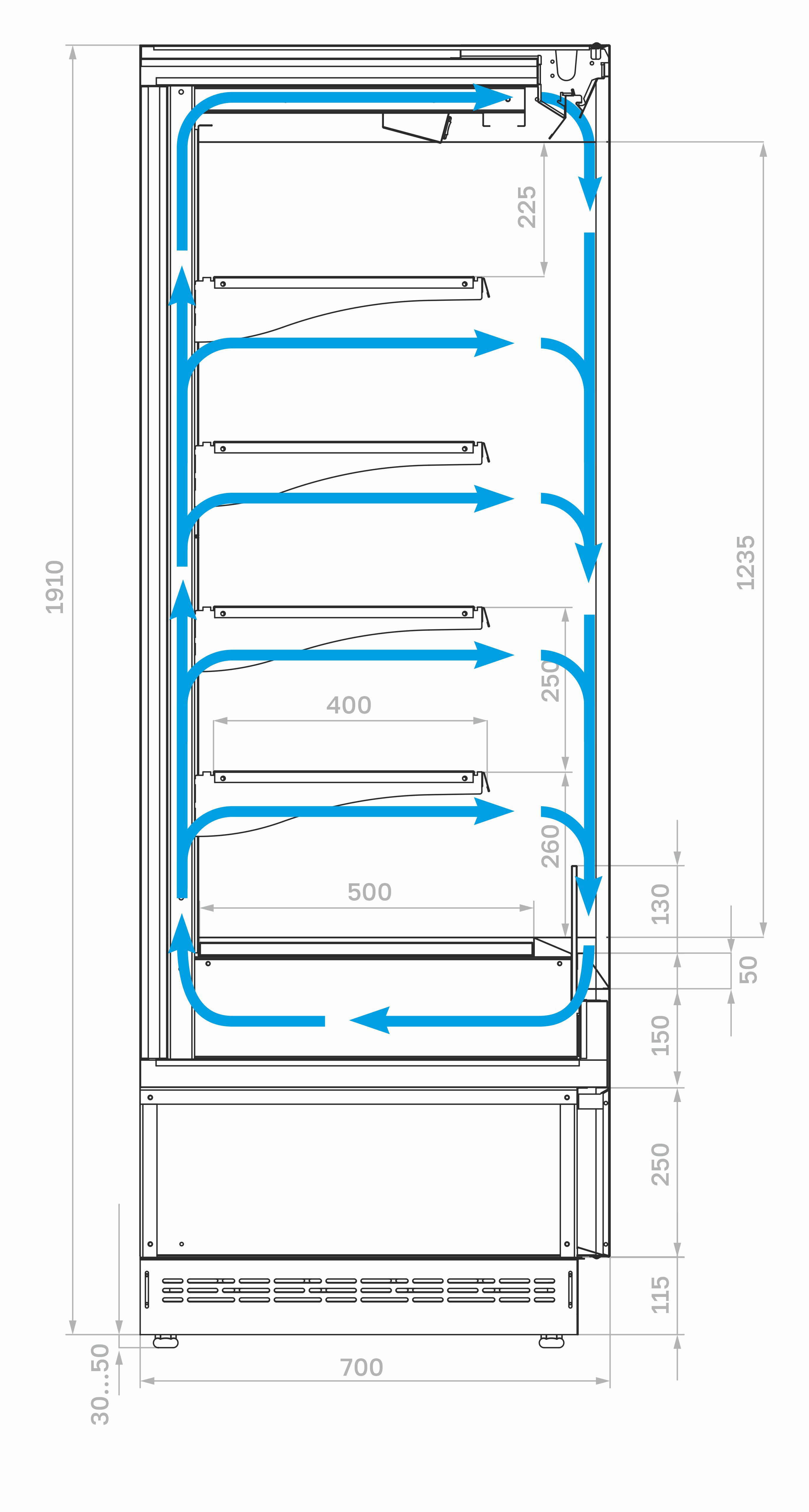 Модель оснащена 4 рядами навесных полок с кронштейнами, подставкой с фронтальной термовыводящей и цокольной решетками. Корпус прямоугольной формы изготовлен из стали с антикоррозийным покрытием: внешние панели, полки и кронштейны серого цвета (RAL 9006), цоколь и интерьер — черного цвета (RAL 9005). Теплоизоляция выполнена из пенополиуретана.