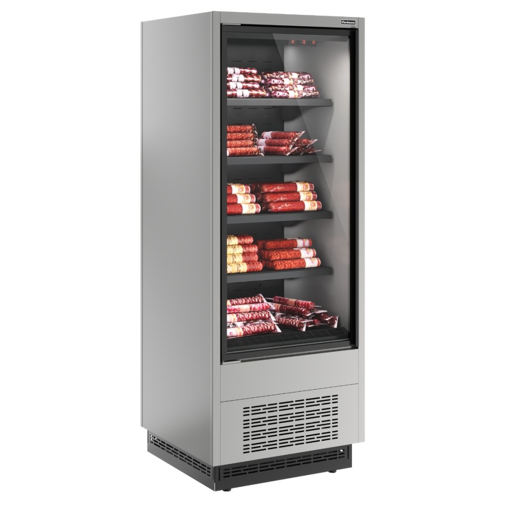 Горка холодильная Carboma FC20-07 VV 0,7-1 0030 STANDARD фронт X1 (версия 2.0) (9006-9005) (бок металл с зеркалом) применяется в предприятиях общественного питания и торговли для эффективного охлаждения, кратковременного хранения и предпродажной демонстрации напитков, мясных и птицеводческих продуктов, полуфабрикатов, молочной и гастрономической продукции.
