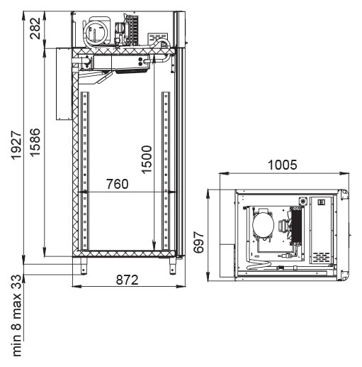 Каталог оборудования Холодильное оборудованиеШкафы холодильныеСпециализированные холодильные шкафыШкаф холодильный для вызревания салями Polair CS107 Salami черный, со стеклом Шкаф холодильный для вызревания салями Polair CS107 Salami черный, со стеклом Код товара: 062-632 Поделиться: WhatsAppTelegram СравнитьДобавить в КПВ избранное 0 373 915 ₽ В корзину 0 шт Под заказСамовывоз сегодня бесплатно Взять в кредит Купить в лизинг Получить консультацию в WhatsApp Описание Характеристики Отзывы 0 Инструкции 5 Шкаф холодильный для вызревания салями Polair CS107 Salami черный, со стеклом предназначен для приготовления и хранения салями, сыровяленых колбас и других мясных деликатесов на предприятиях общественного питания и торговли. Цельнозаливной монолитный корпус выполнен из нержавеющей стали снаружи и внутри (кроме задней стенки), что обеспечивает высокую прочность, долговечность и удобство ухода. Оборудование рассчитано на работу при температуре окружающей среды до +40 °С. Особенности: Динамическое охлаждение с мягким обдувом без заветривания Верхнее расположение агрегата Автоматическая оттайка с системой испарения конденсата Русифицированная многофункциональная панель управления с дисплеем диагональю 5" Возможность создания и сохранения индивидуальных программ Встроенный ультразвуковой увлажнитель (необходима подача очищенной воды и подключение к канализации) UV-лампа для обеззараживания воздуха внутри камеры Три уровня подвесов с тремя перекладинами и крюками на каждом уровне для удобной развески колбас Регулируемый уровень влажности: от 60 до 95 % Распашная дверь с заливной теплоизоляцией, встроенной ручкой и магнитным уплотнителем Отключаемая LED-подсветка камеры Штампованное углубление в дне корпуса для удобства ухода Педаль для удобного открытия двери Хладагент R290 (пропан) Толщина стенки корпуса: 43 мм Polair CS107 Salami черный, со стеклом — это профессиональный холодильный шкаф, идеально подходящий для цехов, гастробаров и мясных мастерских. Он обеспечивает оптимальные условия для дозревания и хранения деликатесов за счёт точного контроля температуры и влажности, продуманной конструкции и расширенного функционала. Такой шкаф помогает сохранять качество и вкус продукции на высоком уровне.Изображение товара, представленного на фото, может отличаться от его фактического вида. Показать все Габаритные размеры697×1005×1960 ммДиапазон рабочей температурыот -2 до +30 °CДлина697 ммШирина1005 ммВысота1960 ммОбъём700 лКол-во дверей1 Тип двериСтеклянная Уровень влажностиот 60 до 95 %Холодильный агрегатВстроенный Тип оттайкиАвтоматическая Тип охлажденияДинамическое ПодсветкаЕсть UV-лампаЕсть ХладагентR290 Вес нетто160 кгВес брутто190 кгБрендPolairВсе специализированные холодильные шкафы Из нержавейкиВсе специализированные холодильные шкафы Стеклянная дверь Оставить отзыв Еще никто не оставил отзыв на этот товар Схема POLAIR CS107 Salami.jpgИнструкция на POLAIR CS107 Salami.pdfБрошюра на POLAIR CS107 Salami.pdfДекларация о соответствии.pdfСертификат соответствия.pdf Похожие товары Перейти в каталог Под заказ 391 000 ₽ Шкаф холодильный для вызревания сыра Polair CS107 Cheese полки нерж. Под заказ 399 500 ₽ Шкаф холодильный для вызревания мяса Polair CS107 Meat со стеклом (Тип 1) Под заказ 405 450 ₽ Шкаф холодильный для хлебопекарных производств Polair CS107 Bakery Br черный, со стеклом (Тип 1) Под заказ 419 900 ₽ Шкаф холодильный для хлебопекарн