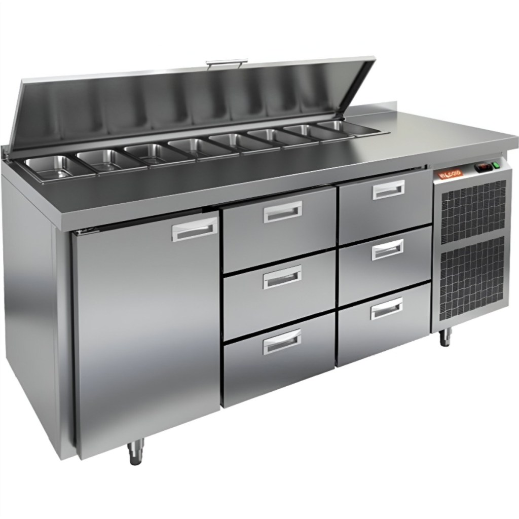 Каталог оборудования Холодильное оборудованиеСтолы охлаждаемыеСтолы холодильные для салатовСтол холодильный для салатов HiCold SL1-133GN (1/3) с крышкой Стол холодильный для салатов HiCold SL1-133GN (1/3) с крышкой Код товара: 064-848 Поделиться: WhatsAppTelegram СравнитьДобавить в КПВ избранное 0 209 962 ₽ В корзину 0 шт Под заказСамовывоз сегодня бесплатно Взять в кредит Купить в лизинг Получить консультацию в WhatsApp Описание Характеристики Отзывы 0 Стол холодильный для салатов HiCold SL1-133GN (1/3) предназначен для использования на предприятиях общественного питания и торговли. Он объединяет рабочую поверхность и охлаждаемый отсек, что делает его удобным решением для хранения, охлаждения и подготовки ингредиентов при приготовлении салатов, пиццы и других блюд. Такая конструкция позволяет повару работать быстрее и эффективнее, так как все необходимые продукты находятся под рукой. Корпус и столешница выполнены из прочной нержавеющей стали, устойчивой к коррозии и легко поддающейся санитарной обработке. Металлическая крышка защищает продукты от загрязнений и сохраняет их свежесть. Особенности модели: Электронная панель управления — точная настройка температурного режима. 1 глухая дверь — удобный доступ к холодильному отсеку. 6 выдвижных ящика — быстрое размещение и замена продуктов. Вместимость салат-бара — до 8 гастроемкостей глубиной до 100 мм. Автоматические доводчики дверей с фиксацией в открытом положении. Легкозаменяемые магнитные уплотнители — надежная герметичность. Открытая агрегатная часть — быстрый доступ для обслуживания. Регулируемые по высоте ножки — устойчивость даже на неровном полу. Толщина столешницы, борта и теплоизоляции — 50 мм, что обеспечивает прочность и энергоэффективность конструкции. HiCold SL1-133GN (1/3) — практичное и удобное решение для профессиональной кухни, обеспечивающее удобную подготовку и хранение ингредиентов. Изображение товара, представленного на фото, может отличаться от его фактического вида. Показать все Габаритные размеры1835×700×850 ммДиапазон рабочей температурыот +2 до +10 °CРасположение агрегатаБоковое Материал столешницыНержавеющая Тип столаС дверьми и ящиками Тип двериГлухая Объём505 лКоличество дверей1 штТип гастроемкостейGN 1/3 Количество ящиков6 штРазмер полки530×325 ммНапряжение220 ВМощность0,46 кВтТип охлажденияДинамическое Тип оттайкиАвтоматическая СтолешницаС бортом Габариты в упаковке2000×850×1000 ммВес нетто130 кгВес брутто185 кгБрендHicold Оставить отзыв Еще никто не оставил отзыв на этот товар Ранее просмотрено Под заказ 320 392 ₽ Стол холодильный для салатов HiCold SL1-2222GN (1/3) с крышкой Под заказ 107 451 ₽ Стол холодильный для салатов HiCold SLE3-1GN полипропилен, с крышкой Под заказ 170 901 ₽ Стол холодильный для салатов HiCold SLE3-111GN полипропилен, без крышки