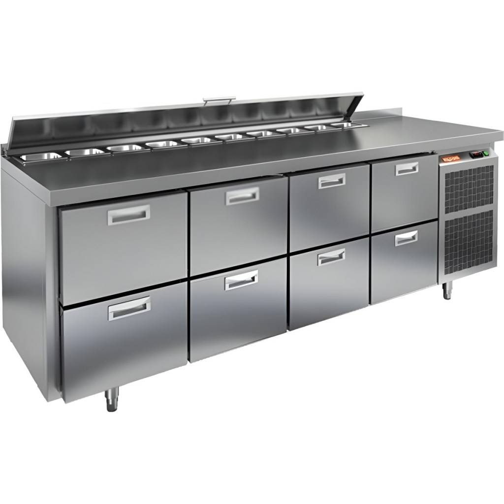 Каталог оборудования Холодильное оборудованиеСтолы охлаждаемыеСтолы холодильные для салатовСтол холодильный для салатов HiCold SL1-2222GN (1/3) с крышкой Стол холодильный для салатов HiCold SL1-2222GN (1/3) с крышкой Код товара: 064-840 Поделиться: WhatsAppTelegram СравнитьДобавить в КПВ избранное 0 320 392 ₽ В корзину 0 шт Под заказСамовывоз сегодня бесплатно Взять в кредит Купить в лизинг Получить консультацию в WhatsApp Описание Характеристики Отзывы 0 Инструкции 2 Стол холодильный для салатов HiCold SL1-2222GN (1/3) с крышкой предназначен для использования на предприятиях общественного питания и торговли. Он подходит для хранения, обработки и кратковременного охлаждения ингредиентов, применяемых при приготовлении пиццы, салатов, закусок и других блюд. Модель совмещает охлаждаемый объем и рабочую поверхность, что значительно повышает удобство и скорость работы персонала. Корпус и столешница выполнены из прочной и гигиеничной нержавеющей стали, устойчивой к влаге, загрязнениям и механическим повреждениям. Металлическая крышка защищает продукты от загрязнений и сохраняет их свежесть. Особенности модели: Электронная панель управления — точная настройка температуры. Салат-бар на 10 гастроемкостей — быстрый доступ к ингредиентам. 8 выдвижных ящика — удобное размещение продуктов. Съёмные магнитные уплотнители — герметичность и стабильная температура. Открытая агрегатная часть — лёгкое обслуживание. Регулируемые ножки — установка на любой поверхности. Глубина гастроемкостей до 150 мм, столешница и теплоизоляция — 50 мм. Высота борта — 50 мм — защита рабочей поверхности. HiCold SL1-2222GN (1/3) с крышкой — универсальное и функциональное решение для профессиональной кухни, позволяющее оптимизировать рабочие процессы и повысить производительность за счет удобного хранения и быстрого доступа к ингредиентам.Изображение товара, представленного на фото, может отличаться от его фактического вида. Показать все Габаритные размеры2280×700×850 ммДиапазон рабочей температурыот +2 до +10 °CРасположение агрегатаБоковое Материал столешницыНержавеющая Тип столаС ящиками Объём660 лТип гастроемкостейGN 1/3 Количество ящиков8 штРазмер полки530×325 ммНапряжение220 ВМощность0,48 кВтТип охлажденияДинамическое Тип оттайкиАвтоматическая СтолешницаС бортом Габариты в упаковке2420×850×1000 ммВес нетто145 кгВес брутто211 кгБрендHicold Оставить отзыв Еще никто не оставил отзыв на этот товар Паспорт на HICOLD SL1-2222GN.pdfДекларация о соответствии.pdf Ранее просмотрено Под заказ 107 451 ₽ Стол холодильный для салатов HiCold SLE3-1GN полипропилен, с крышкой Под заказ 170 901 ₽ Стол холодильный для салатов HiCold SLE3-111GN полипропилен, без крышки
