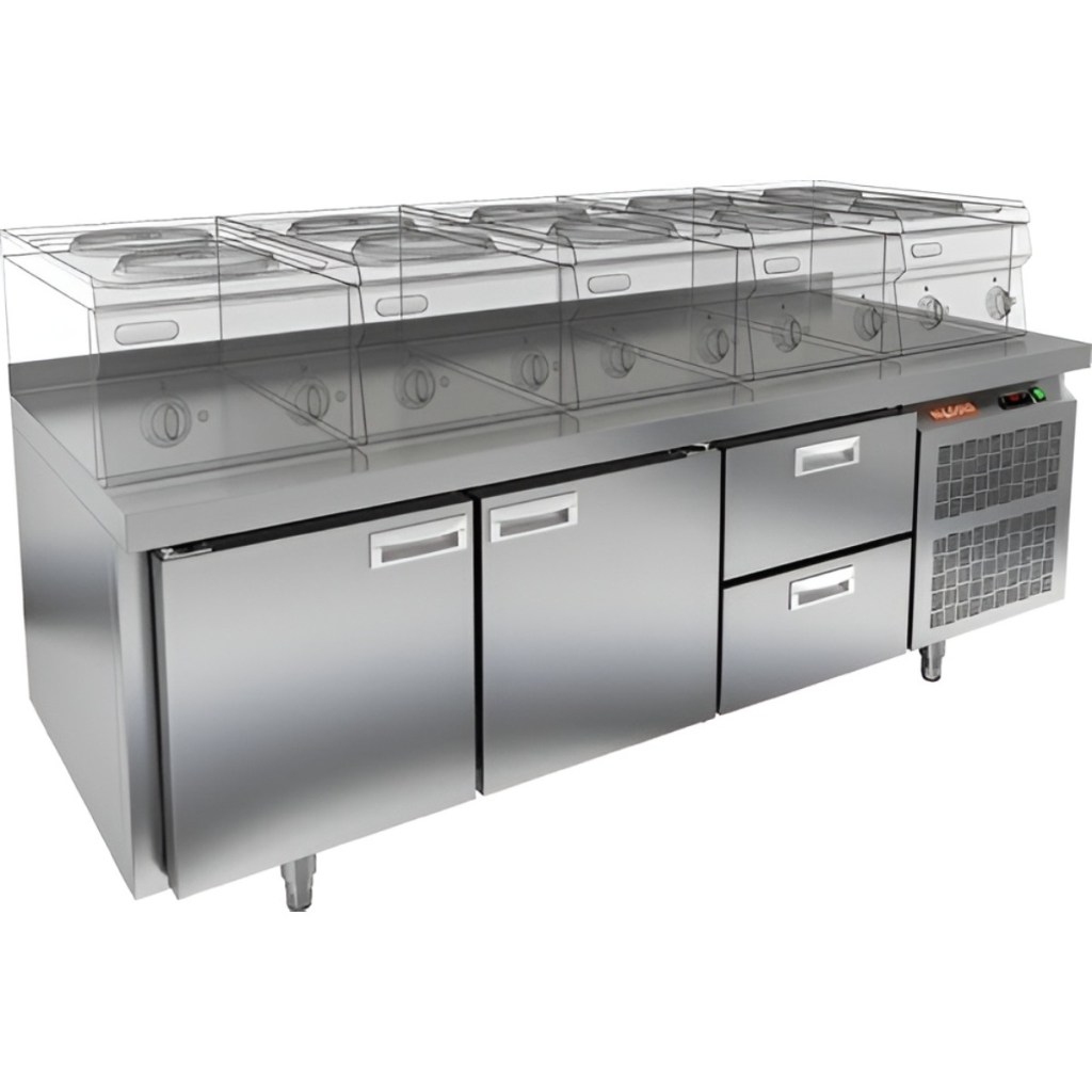 Стол оснащен двумя глухими дверями и двумя выдвижными ящиками, что обеспечивает удобный доступ к продуктам и рациональное использование внутреннего пространства. Оборудование идеально подходит для предприятий общественного питания.