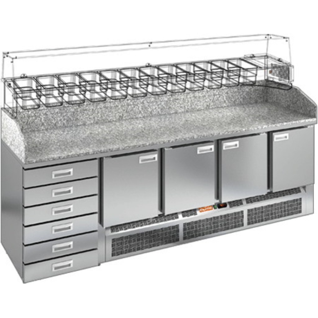 Стол холодильный для пиццы HiCold PZE4-1111/GN камень (R290) предназначен для использования на предприятиях общественного питания и торговли. Он служит не только как удобная рабочая поверхность для раскатки теста и подготовки ингредиентов, но и как холодильный стол для кратковременного хранения заготовок и скоропортящихся продуктов. Конструкция стола совмещает надежность и функциональность: корпус выполнен из нержавеющей стали, а столешница — из прочного гранита.